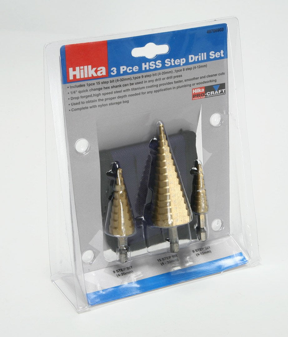 High speed steel titanium coated provides faster smoother cleaner cutting. Use to obtain correct depth for any application. Drills cover 15 step 4-32mm, 9 step 4-20mm, 8 step 4-12mm. Complete with nylon storage bag.